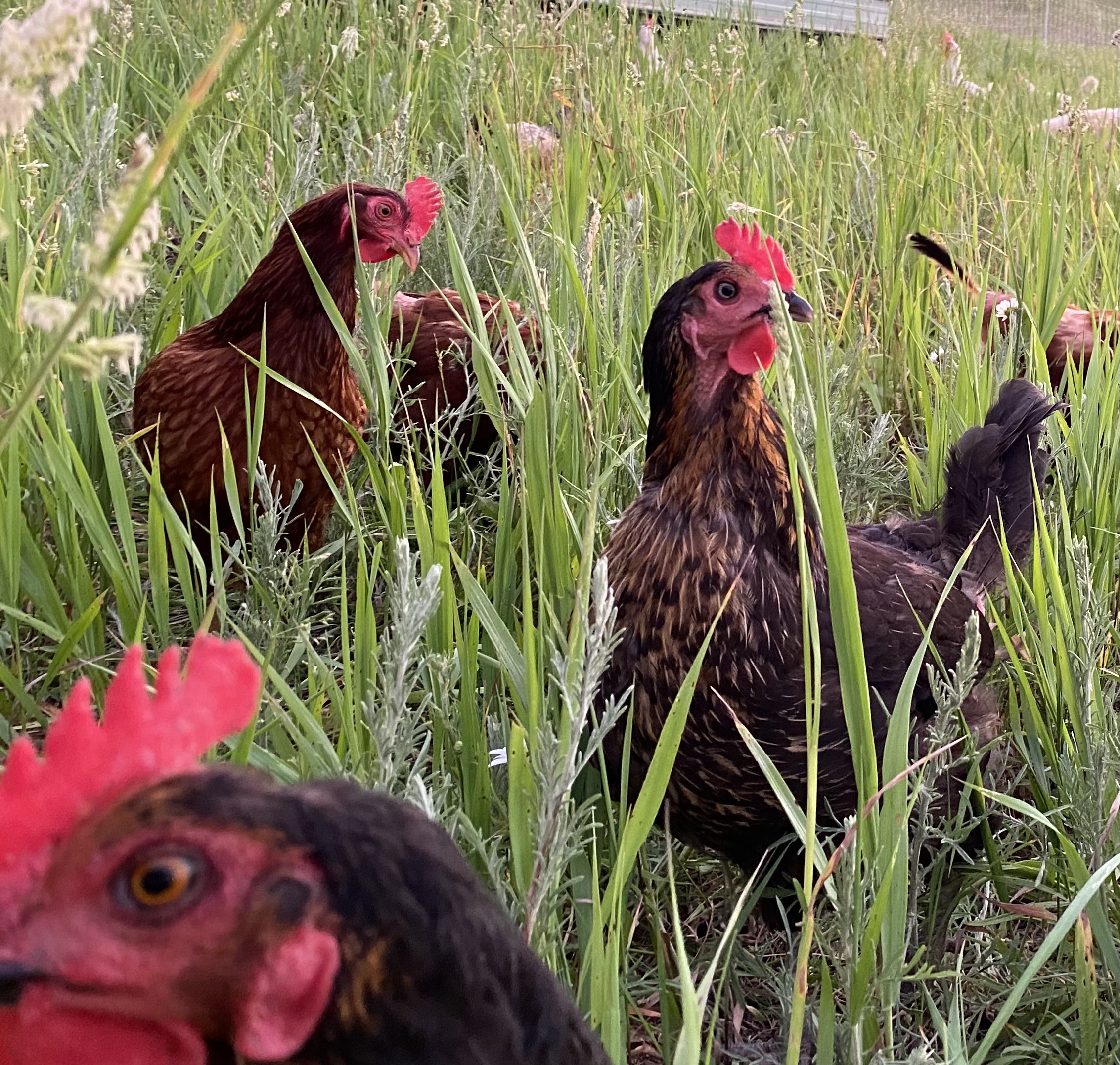 Our chickens follow our cattle in the pasture, naturally grazing on a well balanced diet of plants and insects, making their eggs much healthier than ones from hens raised in barns.